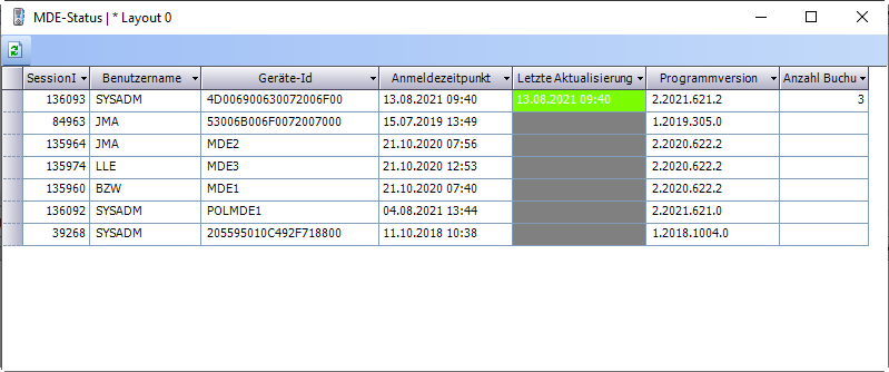 Das Fenster zeigt die aktuell angemeldeten MDE-Geräte und deren Status