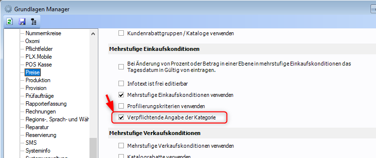Auf Wunsch kann in den Grundlagen festgelegt werden, ob die Kategorie "verpflichtend" angegeben werden muss (Grundlagen Manager / Preise / Mehrstufige Einkaufskonditionen / Verpflichtende Angabe der Kategorie).