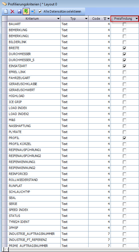 Wird der Haken "Alle Datensätze selektieren" gesetzt, werden auch die Kriterien mit einem Code ungleich 4 angezeigt. Der Haken "Preisfindung" muss dennoch bei den Kriterien gesetzt sein.