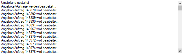 Während der Umstellung kann das Fenster nicht geschlossen werden. In der Statuszeile wird angezeigt welche Dokumentenart bearbeitet wird, wie viele Datensätze bereits bearbeitet wurden, das prognostizierte Ende der Aktualisierung je Dokumentenart und ein Laufbalken.