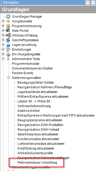 In der Navigationsleiste im Bereich Grundlagen – Administrator Tools – Datenreorganisation - Mehrwertsteuer Umstellung wird das neue Fenster Mehrwertsteuer Umstellung geöffnet.