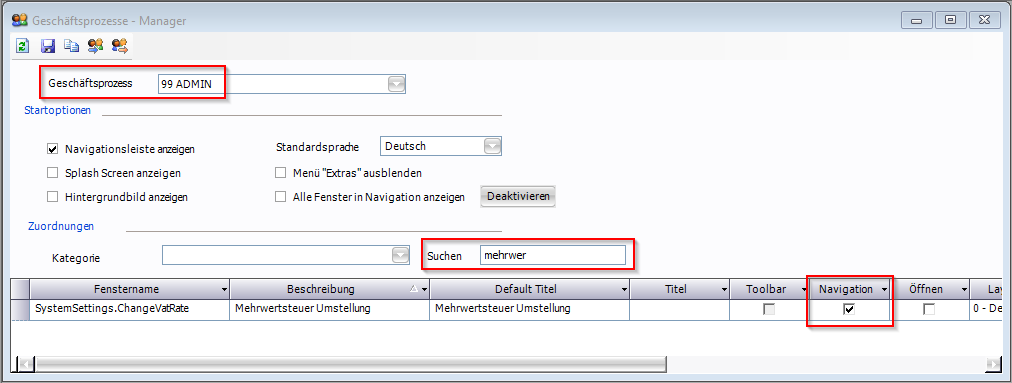 Sollte das Fenster dort nicht angezeigt werden, so müssen Sie es im Geschäftsprozesse – Manager beim gewählten Geschäftsprozess in der Navigation anzeigen.