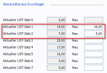 - Werden nur z.B. Bücher verkauft und der Steuersatz 10% kann auf 5% umgestellt werden, dann kann die Umstellung wie oben (für Deutschland) beschrieben durchgeführt werden.