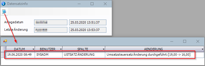 Zu jedem Dokument wird ein Eintrag im Logbuch erstellt. Dieser Eintrag ist ersichtlich, wenn im Dokument unter Sonderfunktionen die Datensatzinfo angezeigt wird.