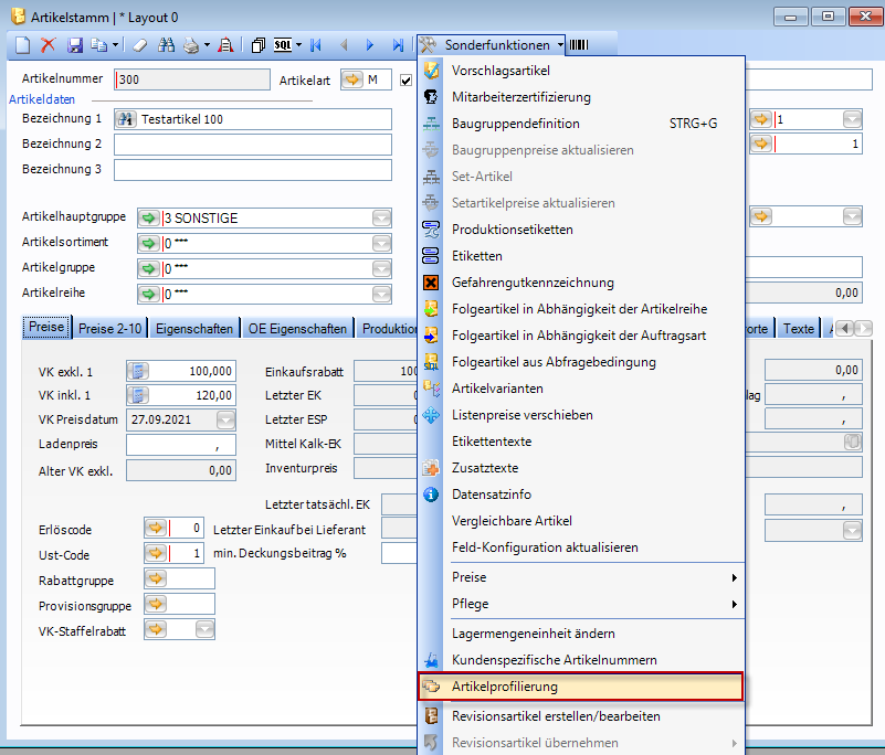 Die Artikelprofilierung ist zu finden im Artikelstamm unter Sonderfunktionen - Artikelprofilierung. Oder in den Karteikarten als eigener Reiter.