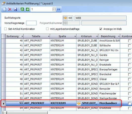 - Anschließend unter "Grundlagen" → "Artikelprofilierung" → "Artikelkriterien Profilierung" das Suchkategorie "WEB" auswählen und einen neuen Eintrag für die gewünschte Kategorie anlegen und richtig einsortieren: