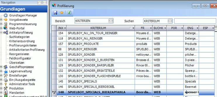 Mit dem Wert aus dem Feld "Kriterium" kann man unter "Grundlagen" → "Artikelprofilierung" → "Übersetzen" im Bereich "KRITERIEN" die gewünschte Kategorie finden und die gewünschten Übersetzungen eintragen.