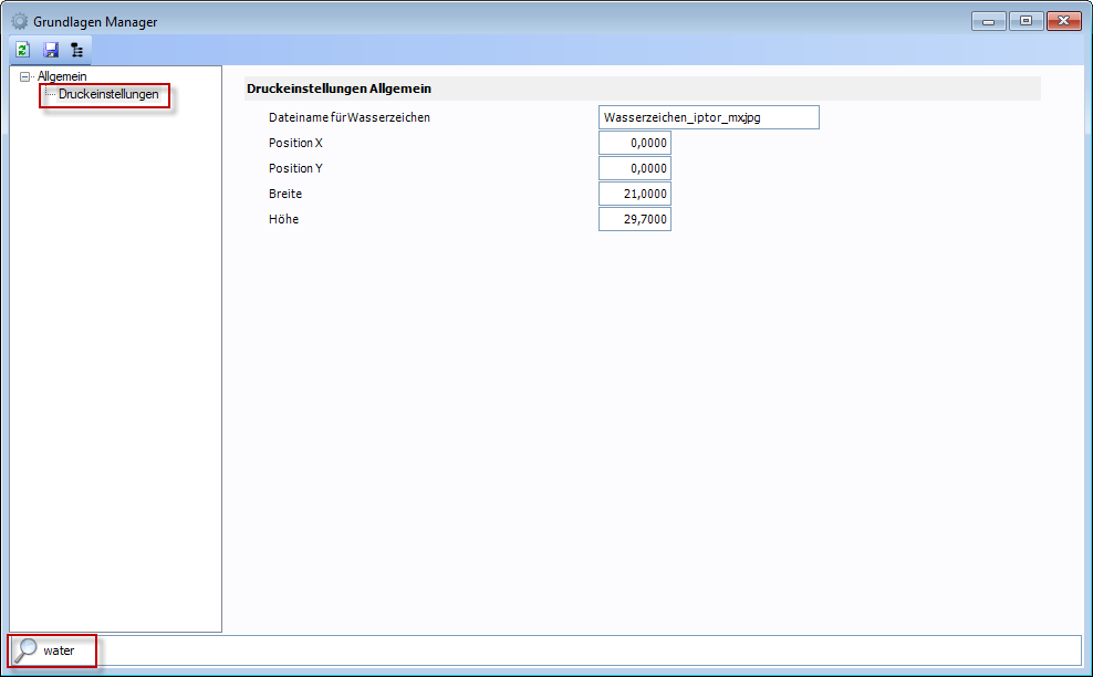 Wenn nur ein Wasserzeichen verwendet werden soll dann muss die Datei im Grundlagen Manager unter Druckeinstellungen hinterlegt werden (Dateiname inkl. Dateiendung)