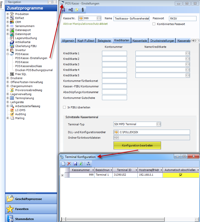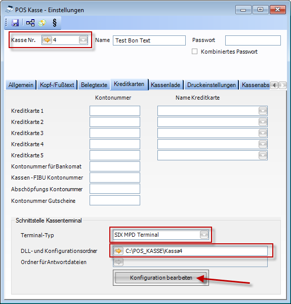 Die Kassenterminals werden in den Kasseneinstellungen verwaltet – gehen Sie dazu auf die Karteikarte „Kreditkarten".