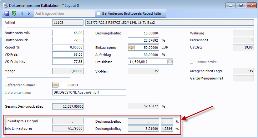 In diesem Fenster werden die zusätzlichen EK-Spalten nicht editierbar mit angezeigt. Diese Werte geben in weiterer Folge Auskunft, über die Kalkulation zum Zeitpunkt der Auftragserfassung.