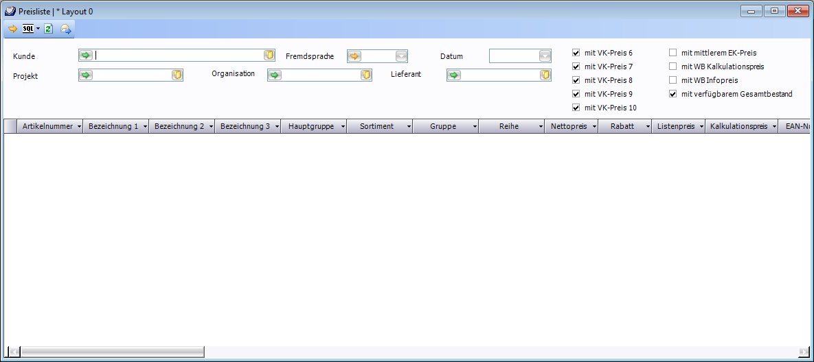 | Auswahl | Öffnet das Fenster "Preispflege - Artikelauswahl | |