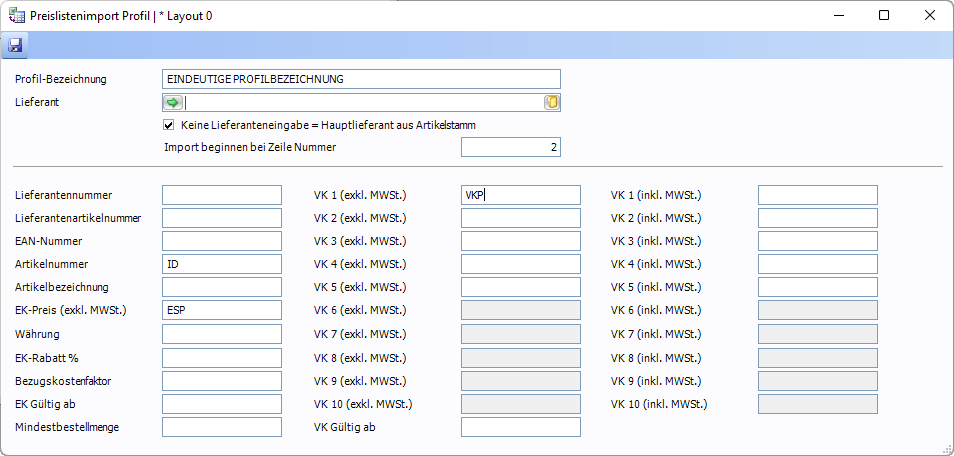 Sollte die Lieferantenummer ebenfalls im Excel gepflegt sein kann diese ebenfalls zugeordnet werden (Feld Lieferantennummer). Das Häkchen bei "Keine Lieferantenangabe = Hauptlieferant aus Artikelstamm" darf in dieser Verbindung nicht gesetzt sein.
