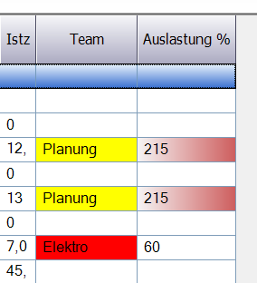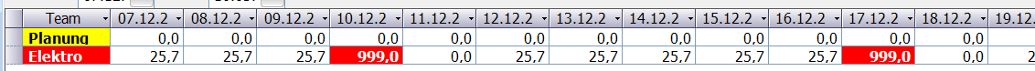 Hat ein Kalendertag KEINE Planstunden, hat aber Durchlaufzeit zugeordnet, so wird der Wert 999 ausgegeben. Beträgt die Auslastung mehr als 100%, so wird die Zelle ROT eingefärbt. Mit dieser Tabelle können rasch Engpässe identifiziert werden. | |