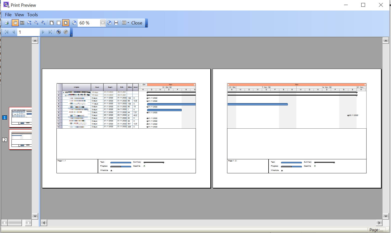 | STRG + P | Druckt die aktuell in der Tabelle befindlichen Fertigungsaufträge und Kostenstellenbelegungen als Tabelle und Gantt-Chart aus. Dabei wird ein mehrseitiger Druck vorgenommen, so dass immer der gesamte Zeitleistenbereich (kleinstes Datum der FA in der Tabelle bis größtes Datum) gedruckt werden kann: