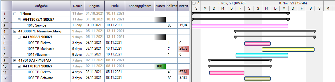 Ist ein Fertigungsauftrag keinem Projekt zugeordnet, so werden diese Fertigungsaufträge unter dem Projekt "-1 None" zusammengefasst. Dies hat keine Auswirkung auf die weitere Planung sondern dient nur der einheitlichen Strukturierung.