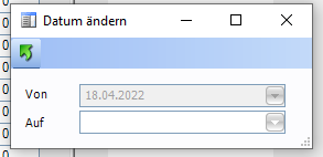 | Termin verschieben | Es wird ein Eingabefenster geöffnet, in dem die Angabe eines neuen Beginn-Datums für den Fertigungsauftrag erfolgen kann. Es werden dann alle im Fertigungsauftrag beinhalteten Kostenstellen um den gleichen "Offset" (Anzahl Tage zwischen altem und neuem Datum) verschoben.