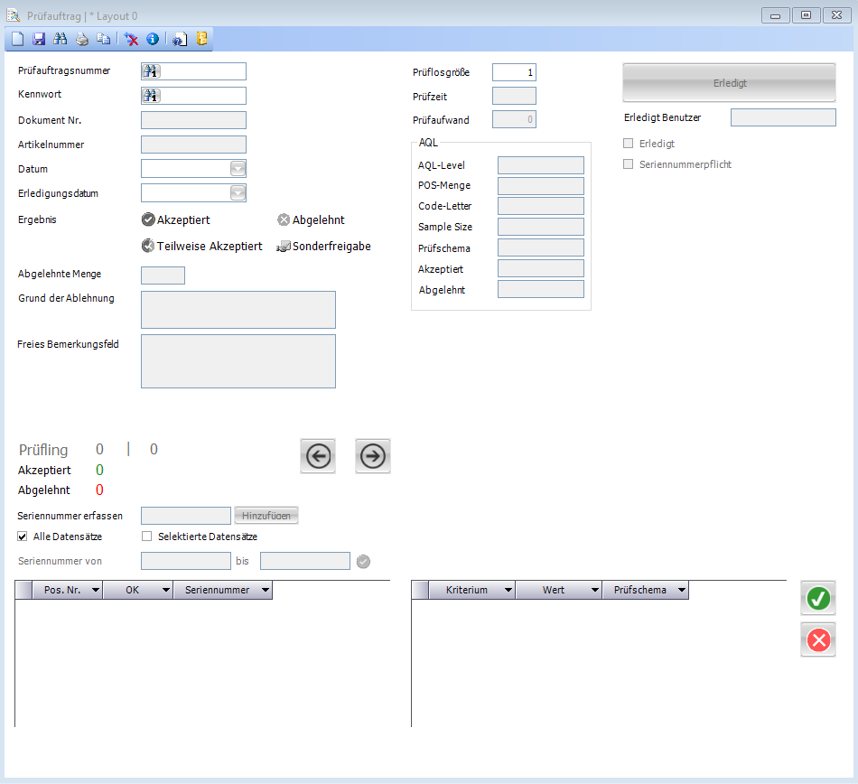 | Prüflosgröße | Anzahl der zu prüfenden Prüflinge. Kann manuell übersteuert werden. Wird automatisch entsprechend der hinterlegten AQL aus dem Artikelstamm ermittelt. |