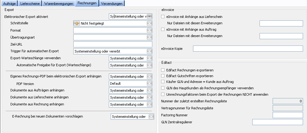 | Elektronischer Export aktiviert | Auswahlfeld (Systemeinstellung oder vererbt / Ja / Nein) | Kennzeichnet, ob der elektronische Export von Rechnungen für diesen Kunden aktiviert ist.
