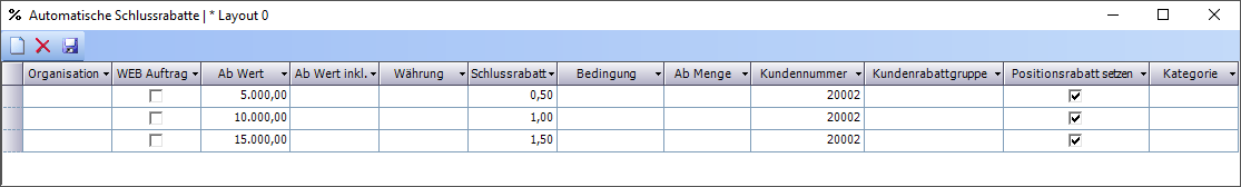 Zum Beispiel soll ab einem Nettogesamtpreis der rabattfähigen Positionen über 5.000,00 € ein Schlussrabatt von 0,50 % vergeben werden. Ab 10.000,00 € dann 1,00 %