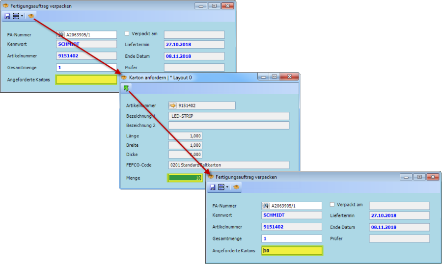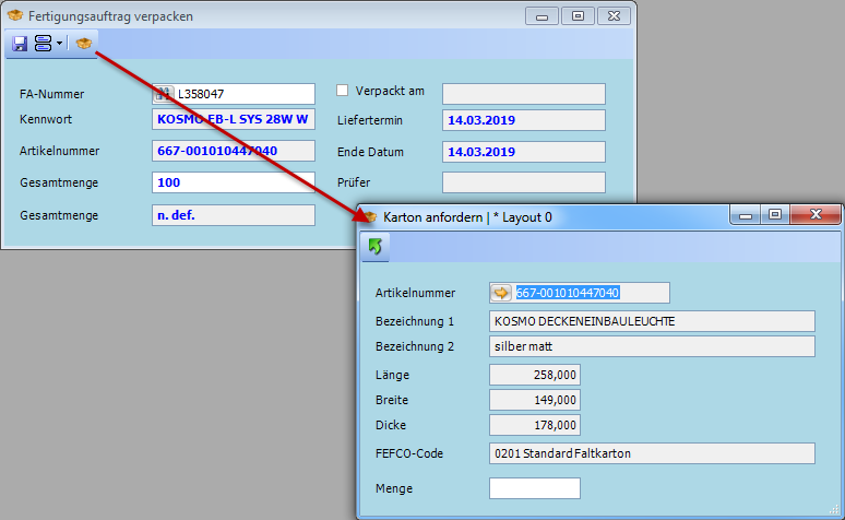 Variante 1: Im Fenster Fertigungsauftrag verpacken ist ein Fertigungsauftrag selektiert – das Fenster Karton anfordern ist mit den Daten des Produktionsartikels vorbefüllt.