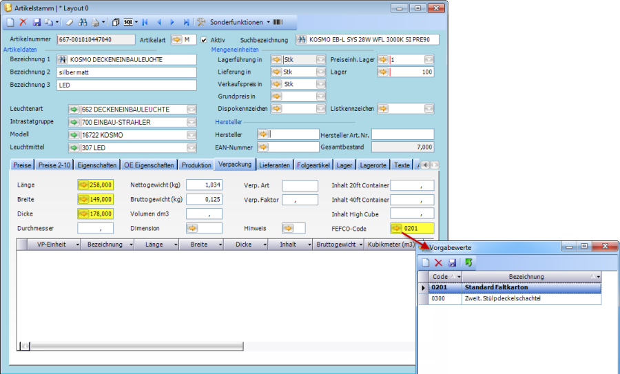 Da die Werte Länge, Breite, Dicke und FEFCO-Code aus dem Fenster Artikelstamm kommen, müssen diese Werte auch dort zum jeweiligen Artikel gepflegt sein. Die Einstellungen dazu befinden sich auf der Karteikarte Verpackung.