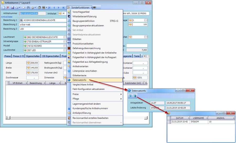 Im Fenster Artikelstamm unter Sonderfunktionen – Datensatzinfo wird das Fenster Datensatzinfo geöffnet, welches Informationen über Anlage und Letzte Änderung des Artikels enthält.
