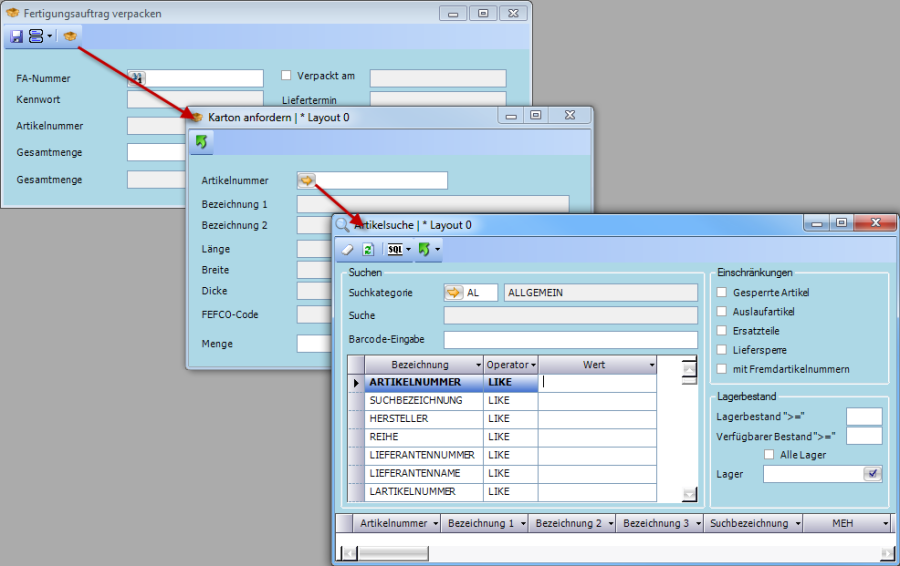 Artikelnummer | Artikelauswahl | Editierbar/nicht editierbar, Pflichtfeld | Das Feld Artikelnummer ist editierbar wenn in FA verpacken kein FA selektiert wurde. Wenn ein FA selektiert wurde ist das Feld nicht editierbar |