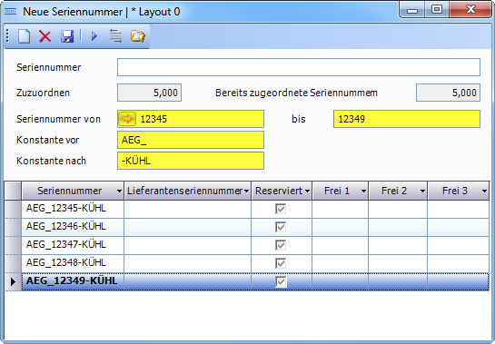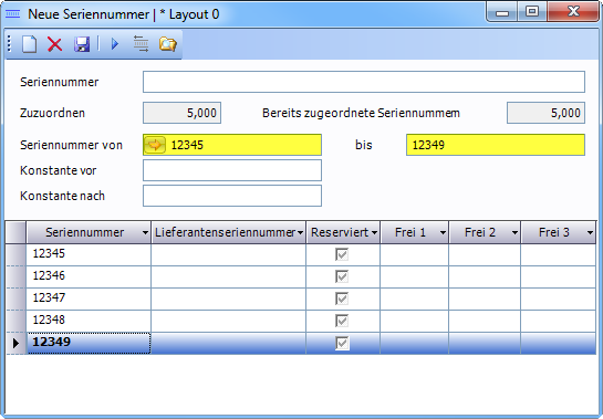 Bei mehreren zuzuordnenden Seriennummern kann Alternativ zur einzelnen Zuordnung von Seriennummern mit dem Symbol „Neu“