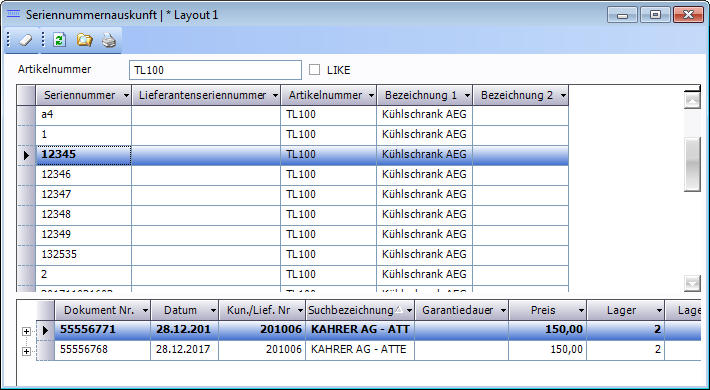 Im Screenshot ist zu sehen, dass für den ausgewählten Artikel und die Seriennummer 12345 zwei Lieferscheine erstellt wurden. Dies bedeutet in diesem Fall, dass bei zwei Stück, die das Lager verlassen haben dieselbe Seriennummer 12345 verwendet wurde.
