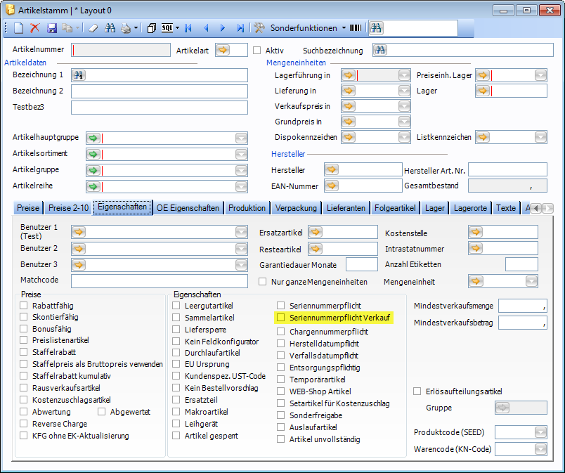 Um einen Artikel als seriennummernpflichtig-Verkauf zu setzen muss im Artikelstamm die entsprechende Eigenschaft Seriennummernpflicht Verkauf aktiviert werden. Diese Option findet sich im Fenster Artikelstamm auf der Karteikarte Eigenschaften im Abschnitt Eigenschaften.