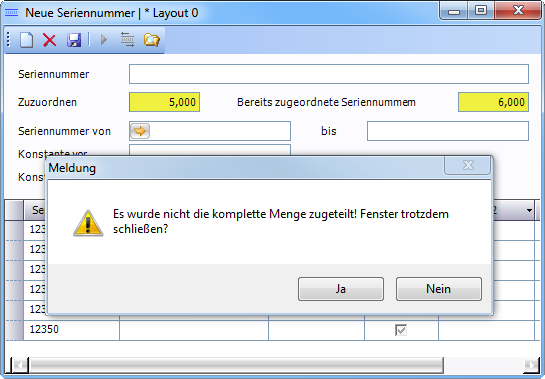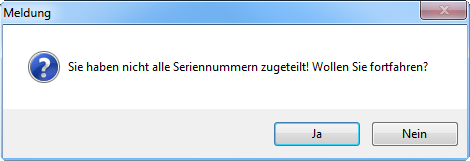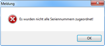 Öffnet sich bei Schließen des Fensters Neue Seriennummer die Meldung „Es wurde nicht die komplette Mende zugeteilt!“, so stimmen die Werte im Feld Zuzuordnen und im Feld Bereits zugeordnete Seriennummern nicht überein. Überprüfen Sie ob zu wenige oder zu viele Seriennummern zugeordnet wurden.