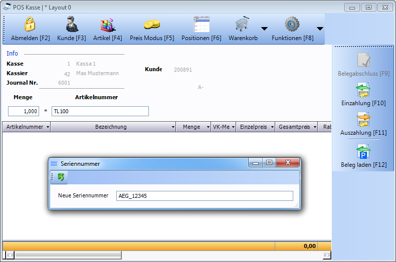 Wird im Feld Menge eine Stückzahl ungleich eins eingegeben und anschließend ein als Seriennummernpflichtig-Verkauf markierter Artikel in die Kasse eingefügt, so wird die Mengenangabe übersteuert. Es muss bei mehreren Artikeln stets einer nach dem anderen eingefügt und einzeln die Seriennummer zugeordnet werden. Ein Klick auf „Übernehmen“