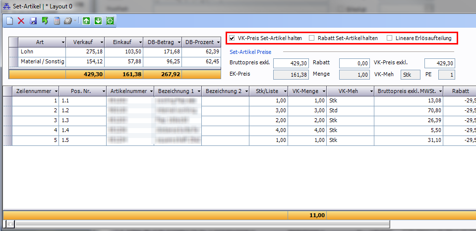 die Felder "VK-Preis Set-Artikel halten", "Rabatt Set-Artikel halten" und "Lineare Erlösaufteilung" sind nicht verfügbar
