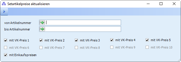 Es werden bis zu 10 Verkaufspreise bzw. fünf Einkaufspreise (mittel EK, letzter EK, mittel ESP, letzter ESP und der Kalkulationspreis) aktualisiert.