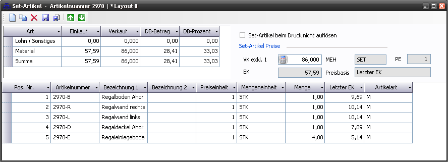 Der aktuell hinterlegte Verkaufspreis des Sets bleibt bestehen, auch wenn Änderungen an der Set-Definition vorgenommen werden. Die Positionen werden automatisch entsprechend rabattiert.