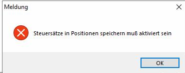 Um diese Meldung zu beheben muss das CLASSIC-DB-Update gestartet werden und dort die Funktion "Umsatzsteuersätze in Positionen speichern" ausgeführt werden.