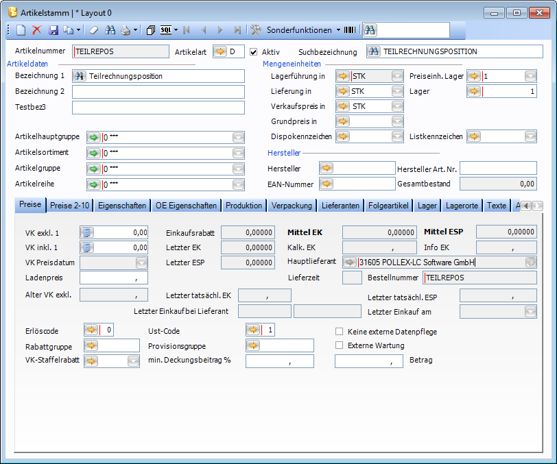 Im Artikelstamm muss ein neuer Artikel (Artikelart „D") angelegt werden, welcher später automatisch in die Teilrechnung eingefügt wird. Die Artikelnummer und die Bezeichnung sind hierbei frei wählbar, es wird allerdings empfohlen die Artikelnummer und die Bezeichnung so zu wählen, dass der Artikel als Teilrechnungsposition identifizierbar ist. Z.B. könnte als Artikelnummer TEILREPOS und als Bezeichnung TEILRECHNUNGSPOSITION gewählt werden.