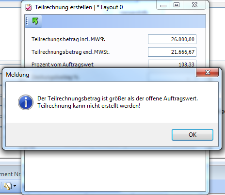 Der Betrag für die Teilrechnungen kann grundsätzlich frei gewählt werden, darf jedoch das Gesamtvolumen des betreffenden Auftrages nicht übersteigen. In diesem Fall wirft das Programm eine Meldung aus, welche darüber informiert, dass der Teilrechnungsbetrag größer dem Auftragswert ist. Eine Teilrechnung kann erstellt werden, unabhängig ob der Auftrag bzw. eine Teilmenge davon schon geliefert ist, also ob ein Lieferschein zum Auftrag existiert oder nicht.
