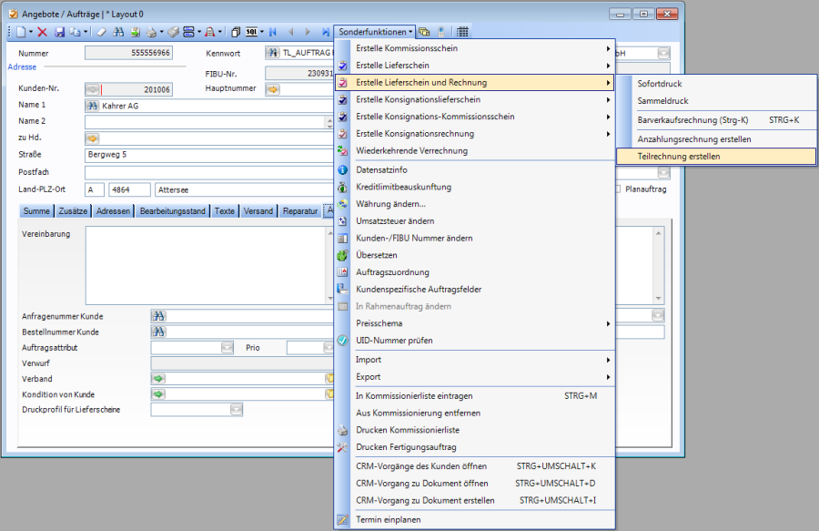 Im Fenster Angebote/Aufträge unter Sonderfunktionen - Erstelle Lieferschein und Rechnung ist nun die Option Teilrechnung erstellen aktiviert.