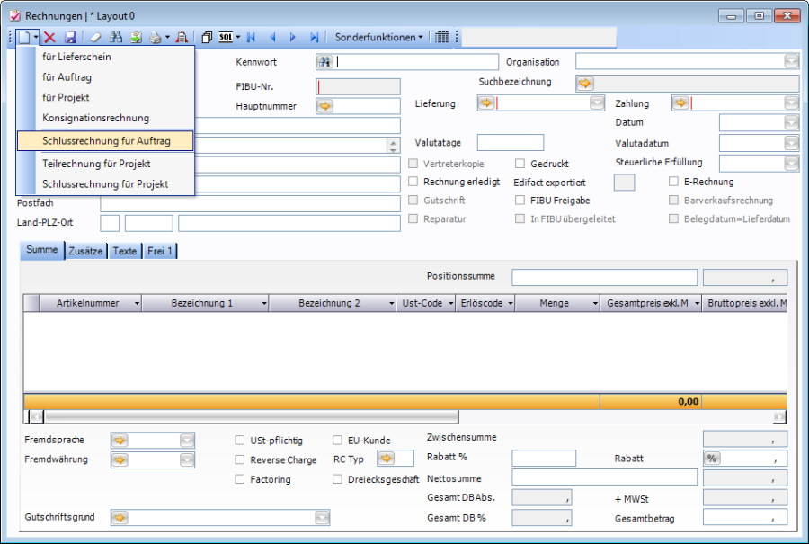 Zur Erledigung des Auftrages muss eine Schlussrechnung erstellt werden. Diese wird direkt aus dem Rechnungsfenster erstellt indem man im Untermenü des Symboles Neu die Option Schlussrechnung für Auftrag auswählt.