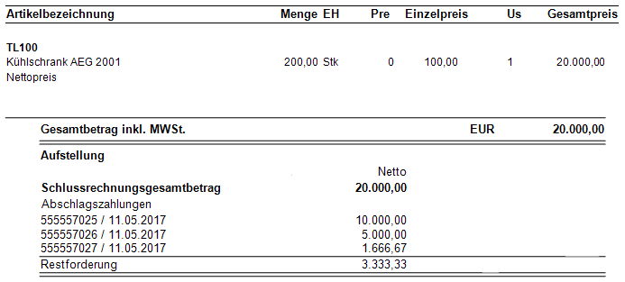Die Schlussrechnung beinhaltet schließlich eine Aufstellung aller im Auftrag erfassten Positionen und dem daraus resultierenden Gesamtpreis. Zusätzlich finden sich die Rechnungsnummern mit den geleisteten Teilzahlungen sowie die daraus resultierende Restforderung (Gesamtauftragswert-Teilrechnungsbeträge=Restforderung) auf der Schlussrechnung.