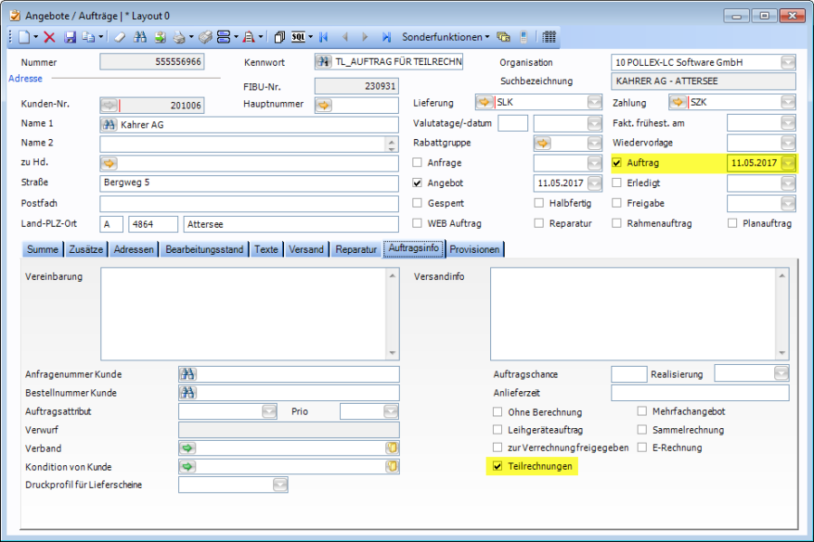 Die nächste Voraussetzung um eine Teilrechnung erstellen zu können ist es, dass ein Auftrag besteht (Auftrag im Fenster Angebote/Aufträge aktiviert), sowie dass in der Registerkarte Auftragsinfo die Option „Teilrechnungen" aktiviert ist.