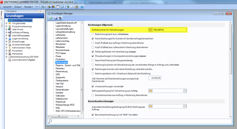 Nun sollte in der Navigation unter Grundlagen der Grundlagen Manager aufgerufen werden. Im Knoten Allgemein unter Rechnungen finden Sie die Einstellung Artikelnummer für Teilrechnungen, wo Sie den zuvor angelegten Artikel nun hinterlegen müssen.