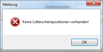 Im Gegensatz zu den Teilrechnungen ist für die Schlussrechnung ein Lieferschein, also zumindest eine teilweise Erbringung der Auftragspositionen verpflichtend. Wurde noch kein Lieferschein erstellt und versucht eine Schlussrechnung zu erstellen erzeugt das Programm folgende Meldung und bricht die Erstellung der Rechnung ab.