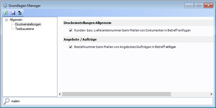 Die beiden genannten Grundlageneinstellungen können im Grundlagen Manager im Knoten Druckeinstellungen aktiviert/deaktiviert werden.