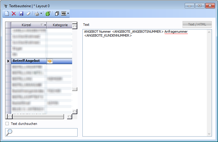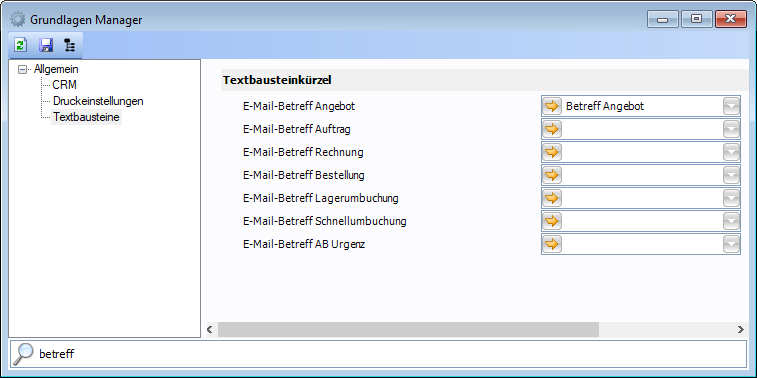 Oben genannte Standard-Texte können allerdings auch ganz individuell übersteuert werden: Im Grundlagen Manager unter dem Knoten Textbausteine gibt es die Felder "E-Mail Betreff Angebot", "E-Mail Betreff Auftrag", usw.