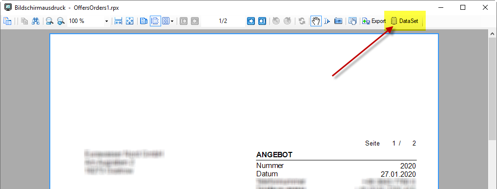 Als Paltzhalter ausgewählt werden kann dabei grundsätzlich jedes Feld, welches in das DataSet des Druckers übergeben wurde. Dieses ist im Bildschirmdruck des Dokumentes mit Klick auf DataSet einsehbar.
