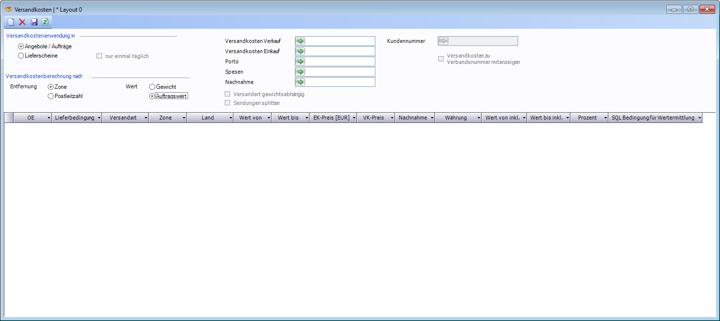 Ist das Feld "Kundennummer" nicht befüllt, erfolgt die normale Abfrage, in der nicht nach der Kundennummer gefiltert wird und alle Datensätze der Versandkostenberechnung angezeigt werden.