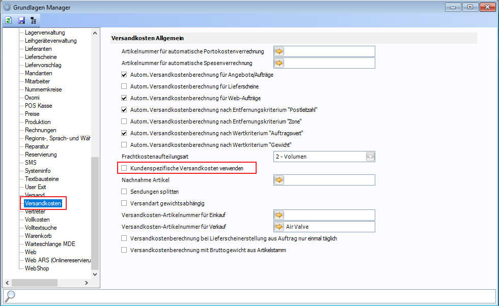 In den Grundlageneinstellungen gibt es die Möglichkeit, unter "Versandkosten" → "Kundenspezifische Versandkosten verwenden" zu aktivieren.
