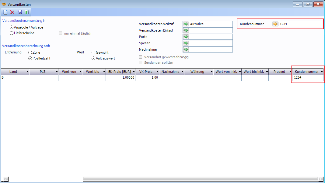 Sobald im Feld "Kundennummer" ein Wert eingetragen ist, erfolgt die Abfrage nach der Kundennummer und es werden nur die für die gewählte Kundennummer eingetragenen Versandkosten angezeigt.